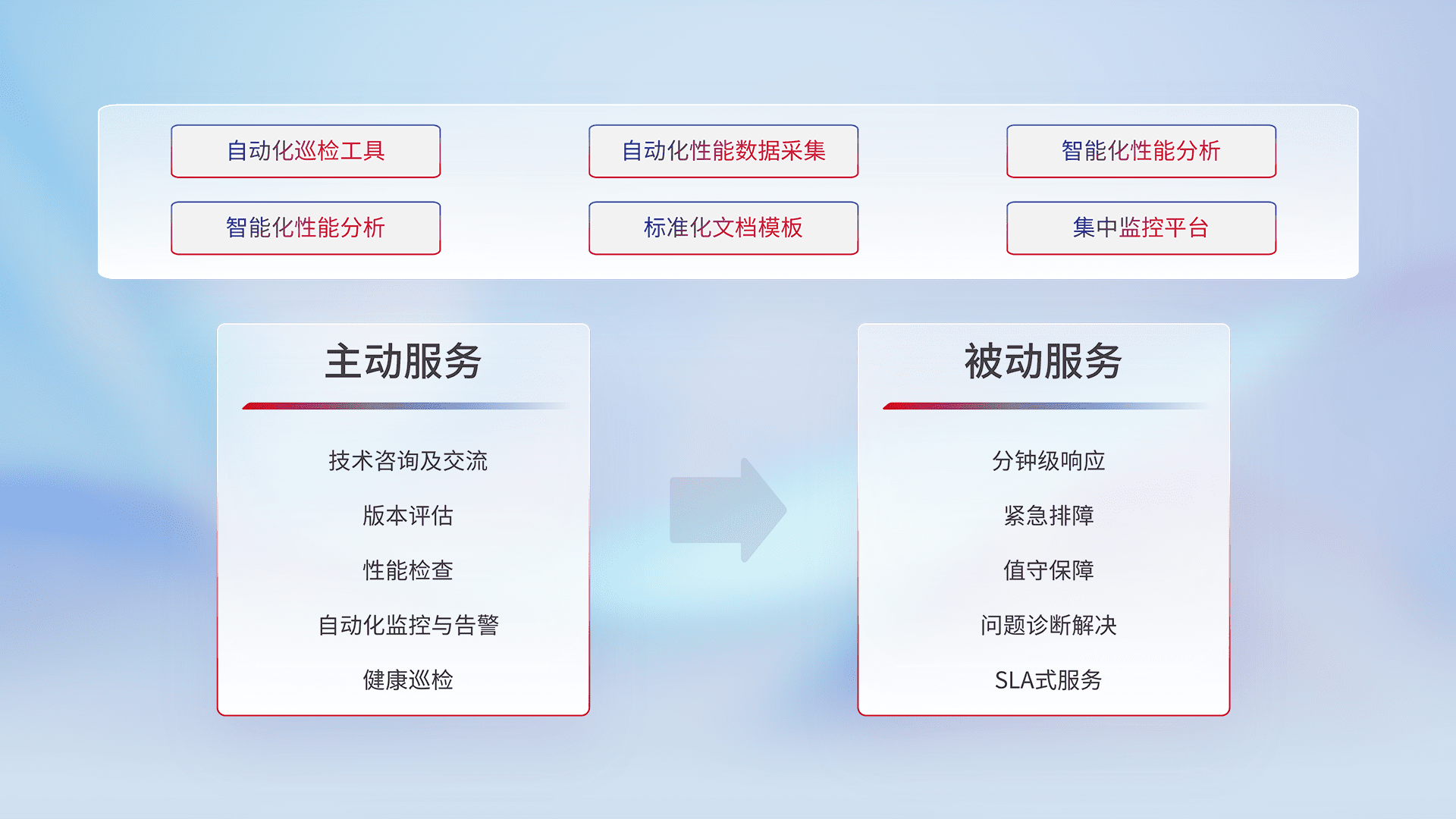 智能化工具和标准化文档,,,,保障服务质量,,,提供主动服务(包含技术咨询、、、版本评估、、性能检查、、自动化监控与告警、、、、健康巡检)和被动服务包含(分钟级响应、、、、紧急排障、、值守保障、、、、问题诊断解决、、、SLA服务)。。